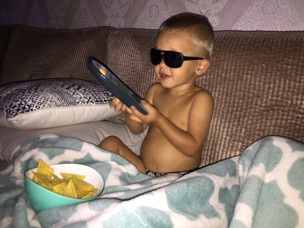 Så vi började titta på film och han dök upp med sina solglajjor och började äta pappas tortilla chips.