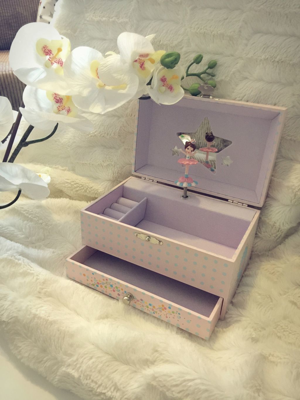 Hon är ju våran lilla prinsessa och hon kommer säkerligen fylla denna skrin med sina läppsyler, smycken och ringar 🙂 Den spelar en melodi när man öppnar locket.
