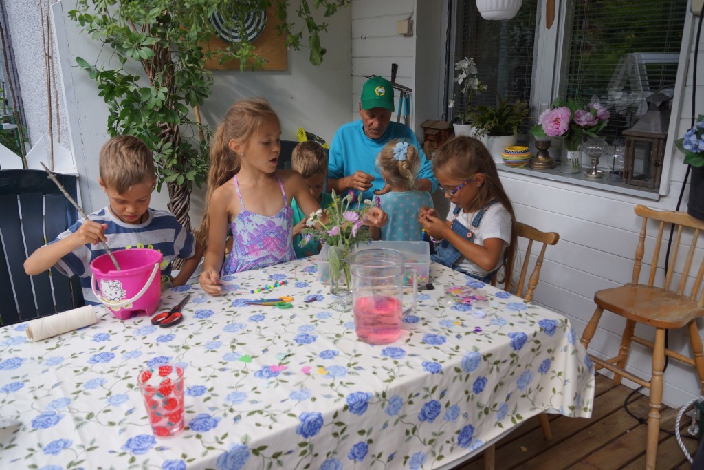 Men idag då när småttingarna vaknade gick vi över till Mummu och Puua. Då hade dom precis grillat korv och hamburgare, Några gjorde armband och andra lagade snigelsoppa (?).
