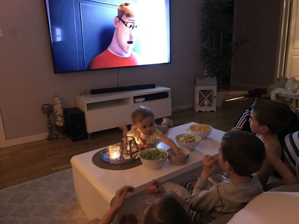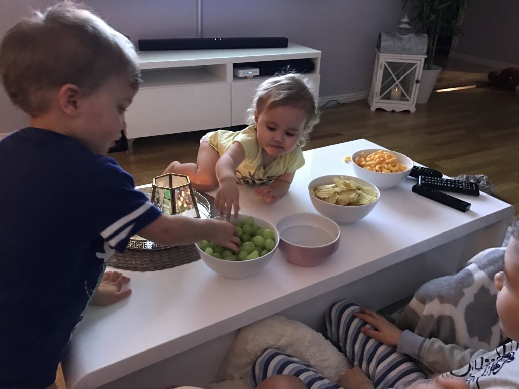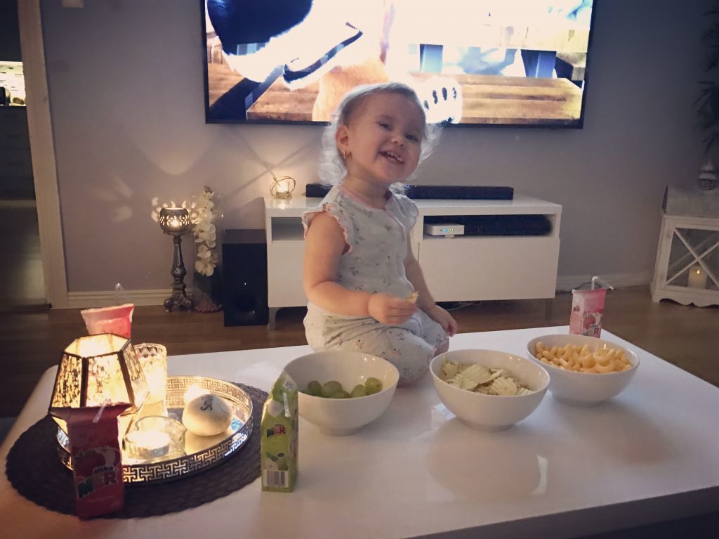 Vi åkte och handlade på eftermiddan och hade myspys på kvällen. Det var Celinas första gång hon fick vara med på myset 😀 Annars har hon fått gå och lägga sig och sen har vi tagit fram gottis. Det har inte funkat förut att ha henne med, hon skulle ha gjort kaos och hällt ut allt. 😉