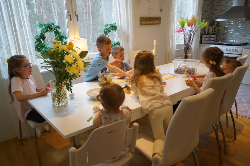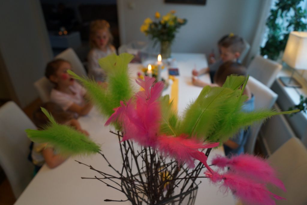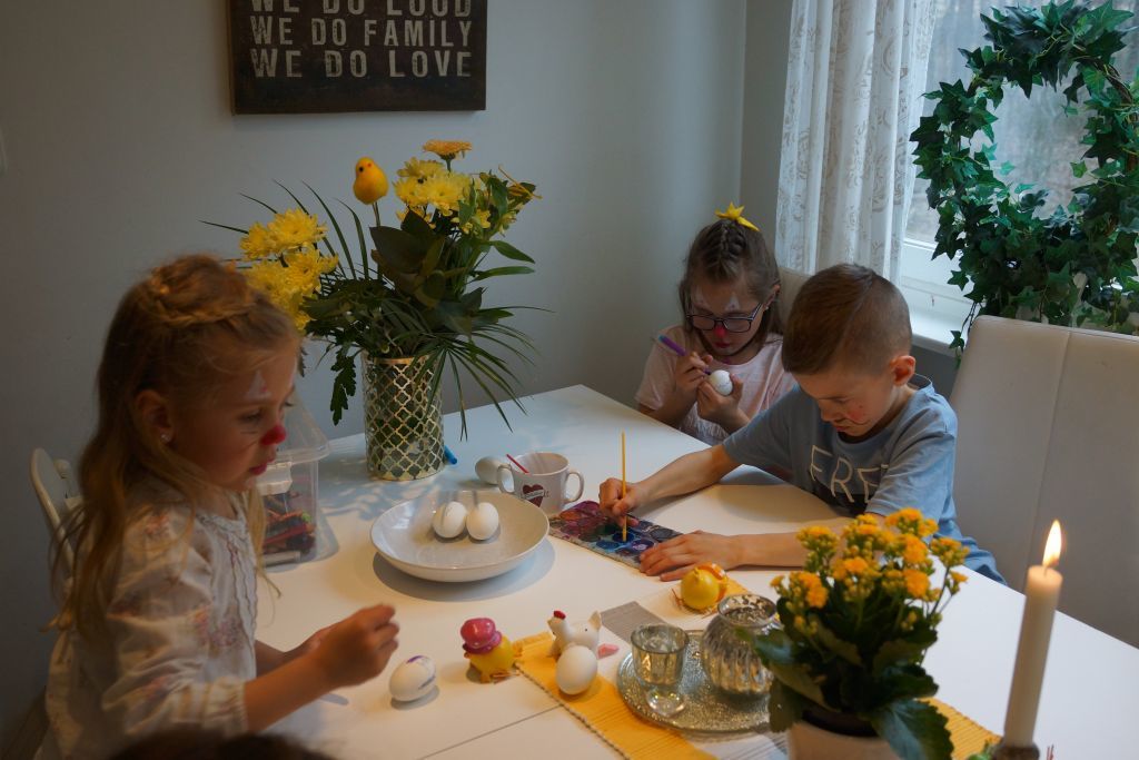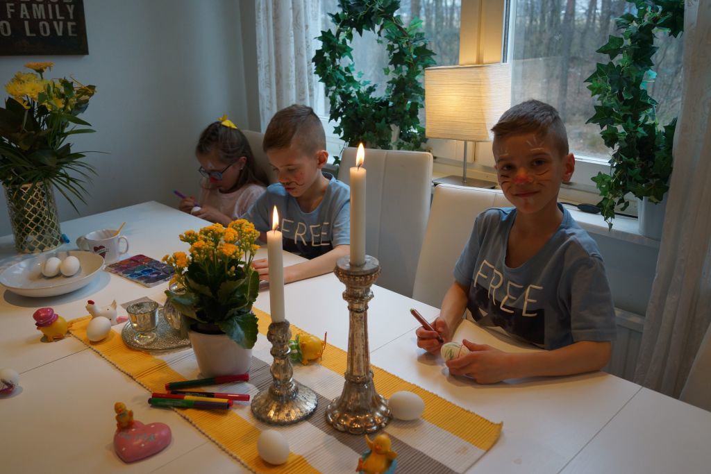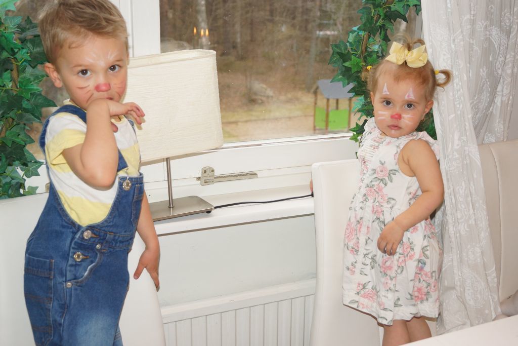 Våra barn brukar ha fått gå över till familj och vänner, men i år blev det inte så. Jag kommer alltid komma ihåg när jag följde min syster och min svägerska att gå runt med Emma & Felicia när dom var kanske 4 år. Då plingade dom på dörren till grannen och sa med hög röst- GLAD PÅSK KÄRRING! Vi brast ut i gapskratt 😀