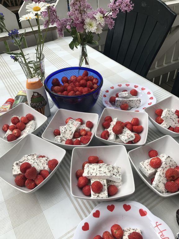 Det har varit ganska fullt upp dessa dagar vi varit hemma. Insåg ganska fort att vi inte skulle bli av med den enorma och dessutom växande tvätthögen här hemma efter resan med bara våran tvättmaskin och tumlare, så vi bokade tvättstugan och tvättade hela 8 maskiner med tvätt. Vi har träffat nära och kära och catch up lite och igår så hade vi den berömda skolavslutning glassen med jordgubbar hos Mummu & Puua.