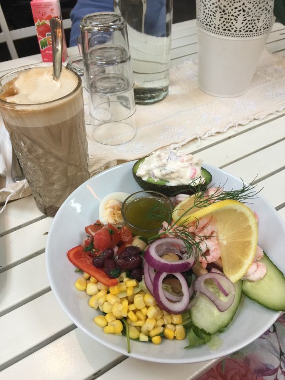 Eftersom han var så duktig så fikade vi lite. Bulle och saft och jag åt en räksallad.