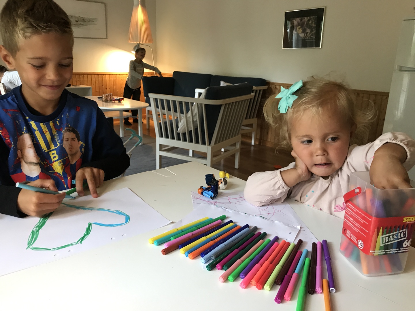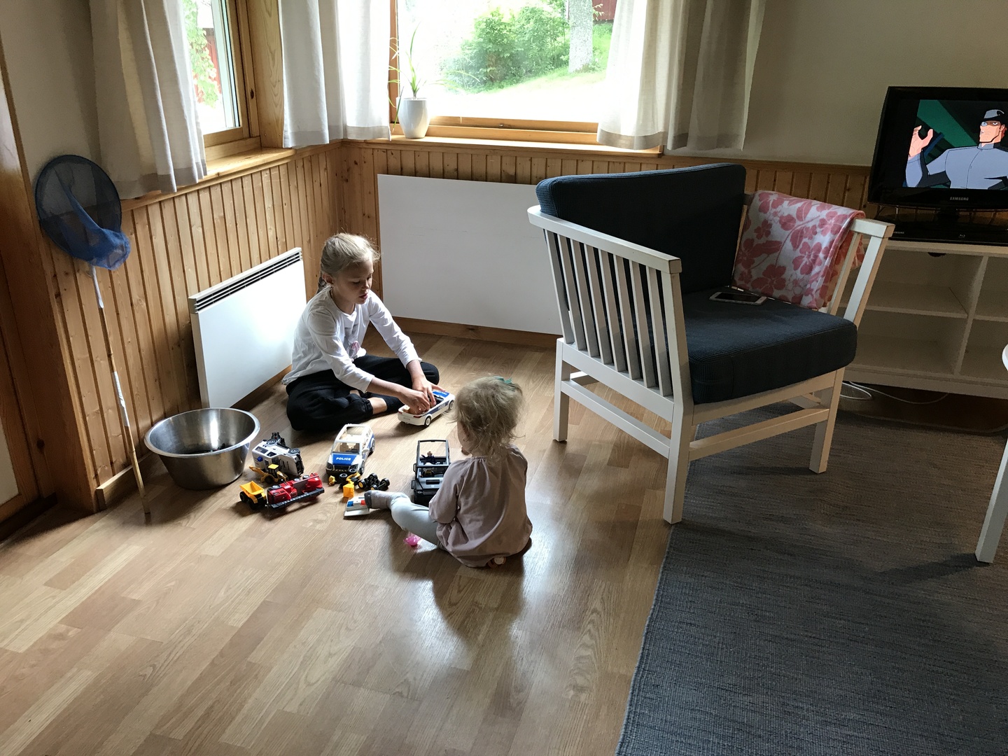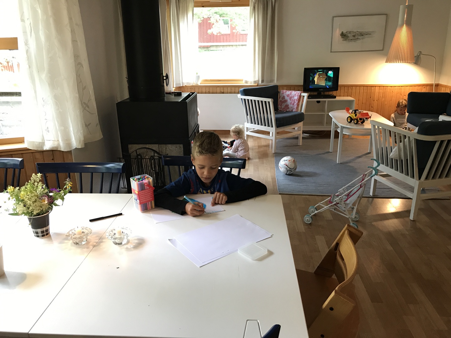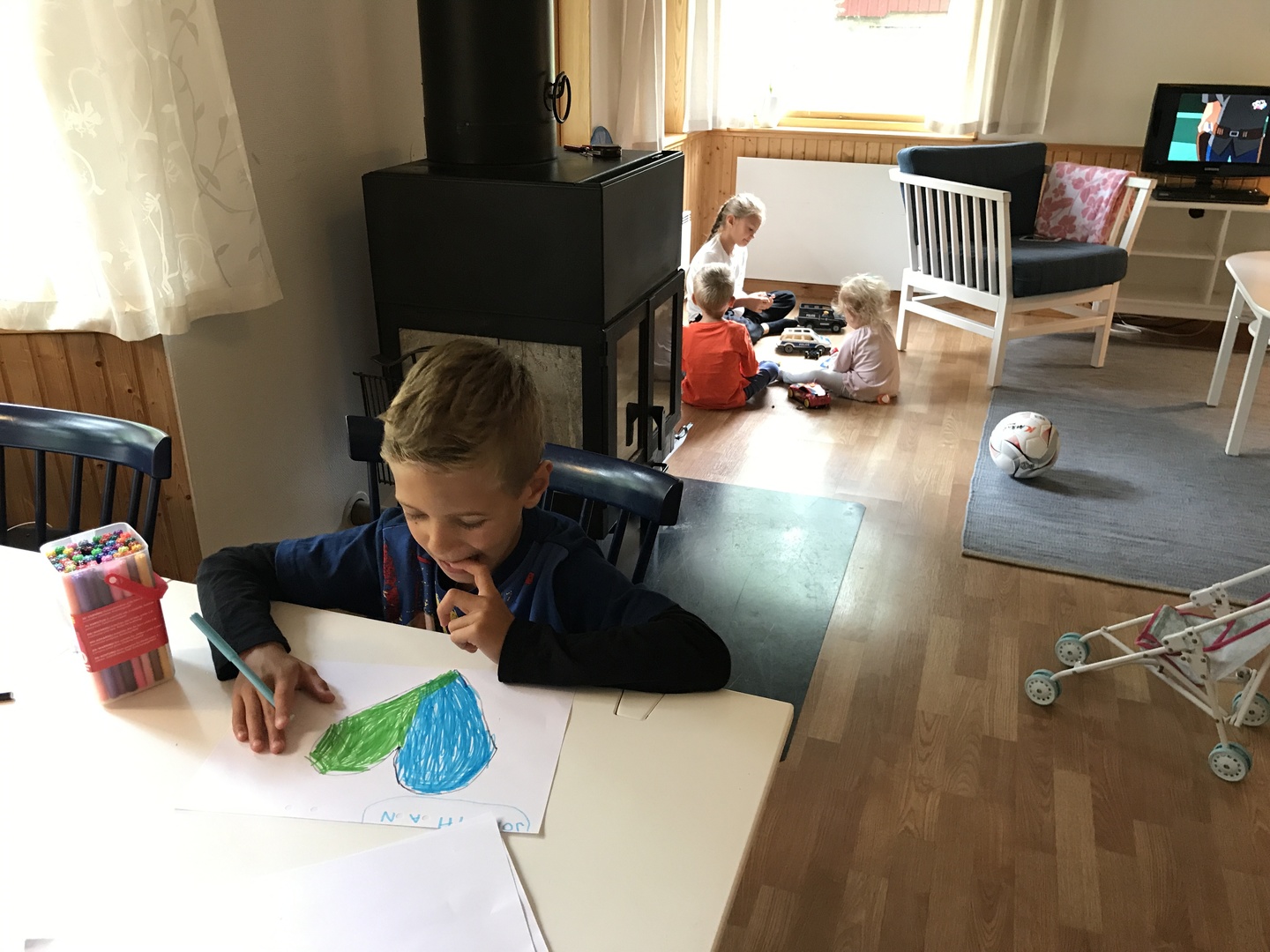Vi gör det bästa av detta väder, just nu går det ingen nöd på barnen, dom har sysselsatt sig med lekar, att rita, spel på mobilen och film.