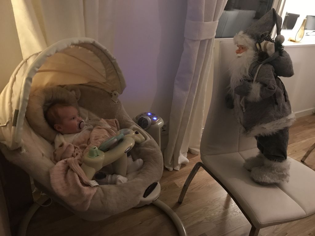När jag kom tillbaka möttes jag av det här. – Isabelle i babygungan och snackar med Jultomten.